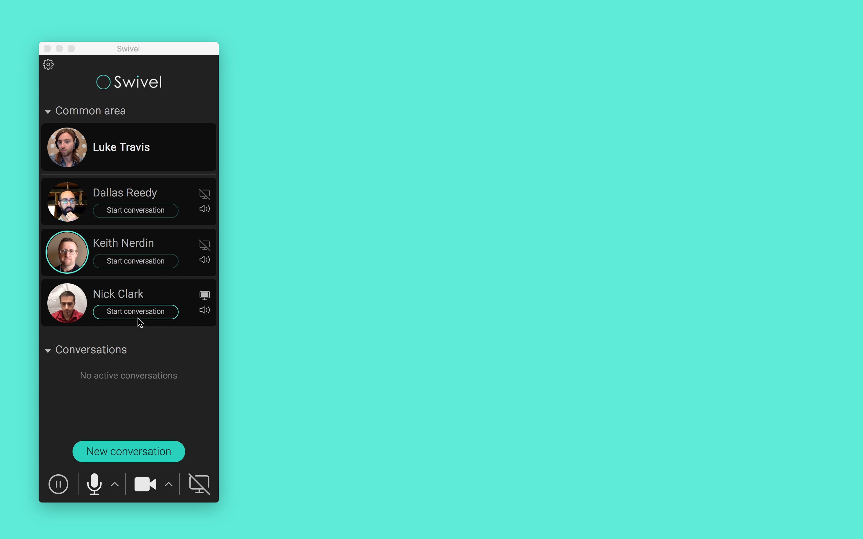 The organic conversations a team experiences when working in a shared physical space are extremely effective at keeping everyone in sync. Officemates passively glean information from those around them, while comfortably participating in conversations when appropriate. These collaborative benefits have long been completely inaccessible to remote workers. Until now. Swivel is changing all that.