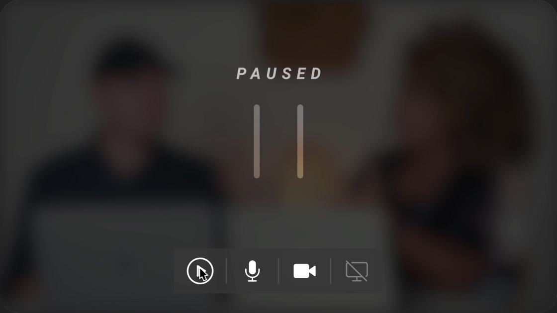 When the realities of remote work strike – the dog barks, your spouse walks in, your kids arrive home from school, or you just really need to heed the call of nature – simply push the pause button. All incoming and outgoing media streams turn off instantly. Your team can easily see you're paused, and when you're done, just click play and you'll be right back to work.